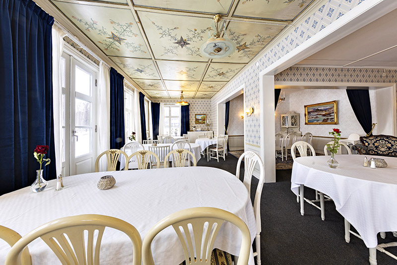 Den stora salongen, eller röda salen, en trappa upp har högt i tak, speglar på väggarna och röda medaljongtapeter, sammetssoffor och kungabilder. Borden i matsalen dukas med vita dukar, porslin med monogram och gärna en röd ros på varje bord. I taket finns målningarna från 1912 kvar i ursprungligt skick. Hyllorna utefter väggen avslöjar ett stort vinintresse hos Erika, med många flaskor hämtade från utvalda vingårdar i Italien.