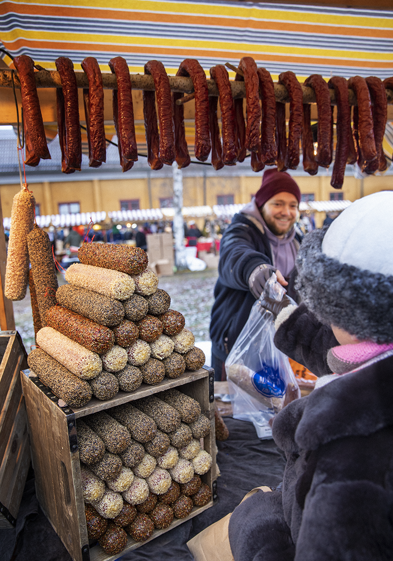 Vi går vidare bland matstånden. Honung från Stjärnsund. Tunnbröd från Rättvik. Äppelmust från Vassbo. Korv från Lillhärdal. Choklad från Furudal. Syrad kål från Vasselhyttan. Renkött från Grövelsjön. För att få en plats här gäller det att leva upp till kraven på lokalt (gränsen tycks gå vid Jämtland), egenproducerat och god kvalitet. Inget krimskrams. Stånden är enhetliga, tillverkade i trä med randiga markiser. Och julmarknaden vid gruvan är, efter drygt tjugo år, en väl inarbetad tradition, hos både marknadssäljare och besökare.
