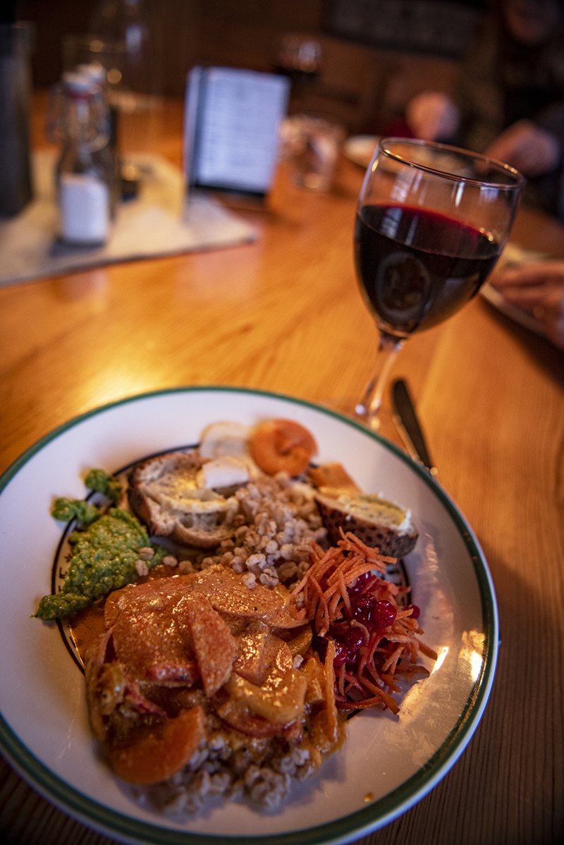 Mysigt är det sedan inne i storstugan med renskinn och sittbänkar med trasmattor. Genom fönstren ser vi den branta fjälltoppen i ett rosaturkost sken från den nedgående solen. I kvällningen sitter vi sedan i matsalen och njuter av kökets saffransgryta med regnbågslax, olika röror och sallad. Allt avslutas med chokladbrownies med kolasås, glass och lingon – så gott!