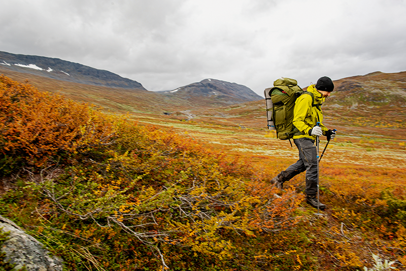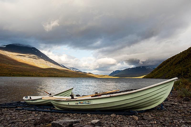 Sträckan Vákkudavárre och norrut till Singistugorna – där leden in mot Kebnekaisemassivet och fjällstationen ansluter – är den mindre frekventerade delen av norra Kungsleden. Den stora strömmen besökare går mellan Abisko och Kebnekaise. I högsäsong kan där bli rejält trångt, på leden och i stugor och fjällstationer. Så här i september, precis innan STF-stugorna stänger för säsongen, är det relativt gott om plats utmed hela leden. Men helt folktomt är det inte och vi möter en hel del vandrare under våra etapper, många från utlandet: tyskar, fransmän och belgare. Två svenska tjejer som springer mellan stugorna träffar vi hastigt när de svischar förbi i Kaitumjaure. Det är kul att öva på engelskan i bastun och höra om mångas ambitiösa planer för hur långt de vill hinna. De sitter där med sina trötta ben och berättar att de vill avverka två etapper dagen efter för att ligga i fas! Vårt mål med turen, att tagga ner och ta det lugnt, känns helt rätt.