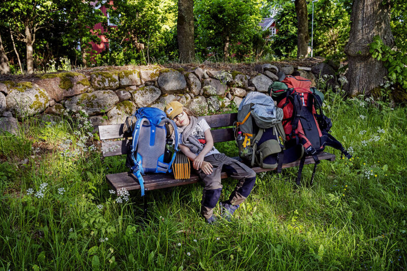 Så hittar vi en glänta i skogen där vi tänker att vi bara ska ta en rast. Snart ändras planen och tält och hängmatta åker fram. Emil stannar kvar hos oss och kvällen ägnas åt att klappa katt och spela Uno. När kvällsmaten stundar kommer vi på att vi behöver mer dricksvatten. En patrull skickas ut och fixar det enkelt i senaste huset vi passerade. Där bor tydligen också Emil, som visar sig heta Frasse. Och som väljer att stanna hemma i stället för att fortsätta luffarlivet med oss.
