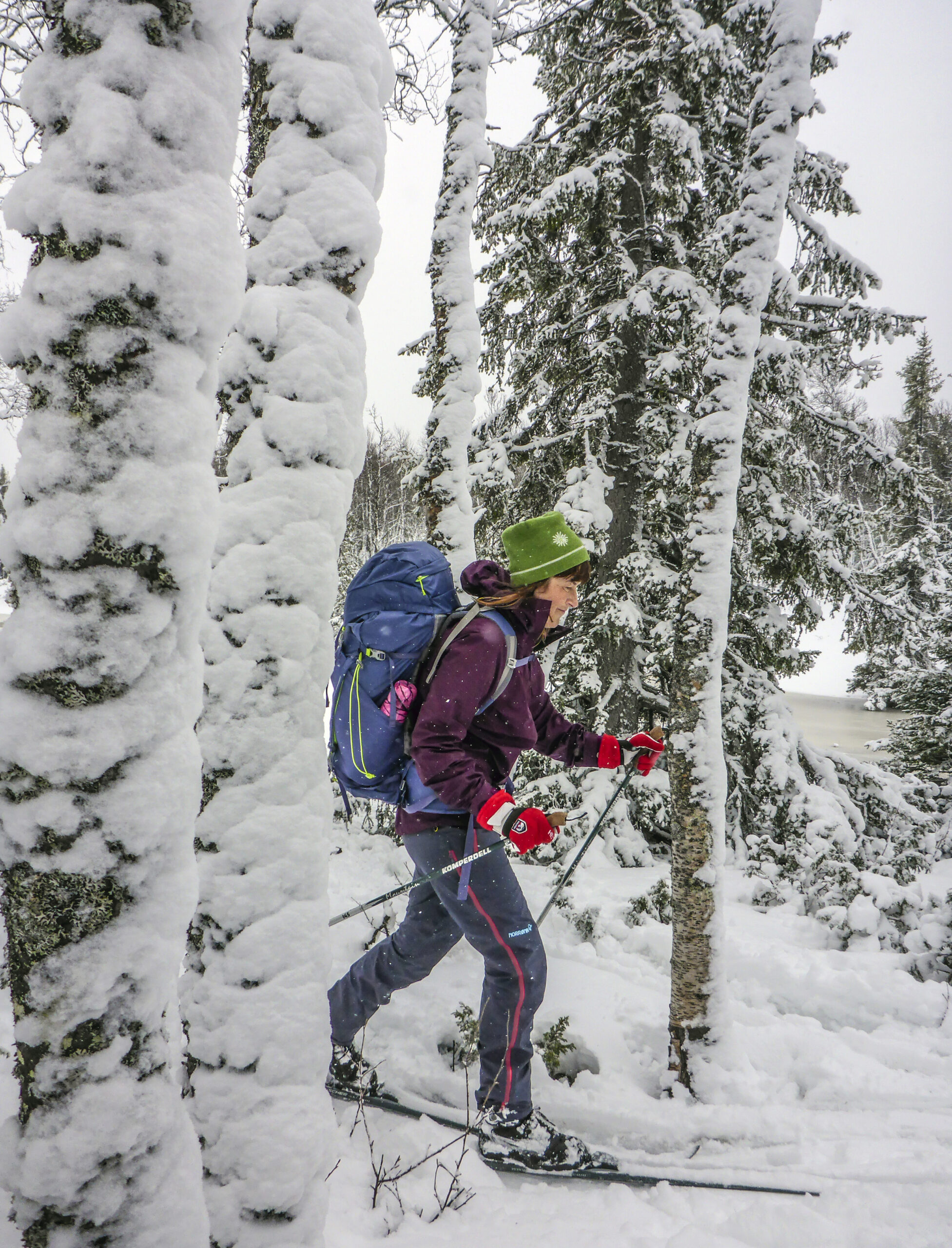 Dagens tur är 13 kilometer i lagom kuperad terräng och kräver ingen större kraft. Att komma till fjälls på vintern är ofta lättsammare än på som­maren. Skidorna glider utför och med bra fäste är det enkelt att gå uppför. I alla fall om man har vallningsfria skidor med ”fiskfjäll” som vi har.