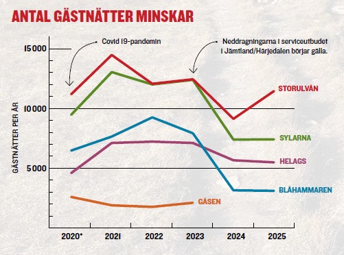 Färre gäster och minskad försäljning i Jämtland har påverkat STF:s ekonomi negativt, även om föreningen budgeterat för minskade intäkter. Mellan 2023 och 2024 minskade omsättningen från STF:s Jämtlandsboenden från 25 miljoner till 16 miljoner kronor, ett tapp på nio miljoner kronor på bara ett år. Nu har siffrorna börjat vända uppåt igen och för 2026 ligger budgeten för Jämtlandsboendenas omsättning på strax över 18 miljoner.